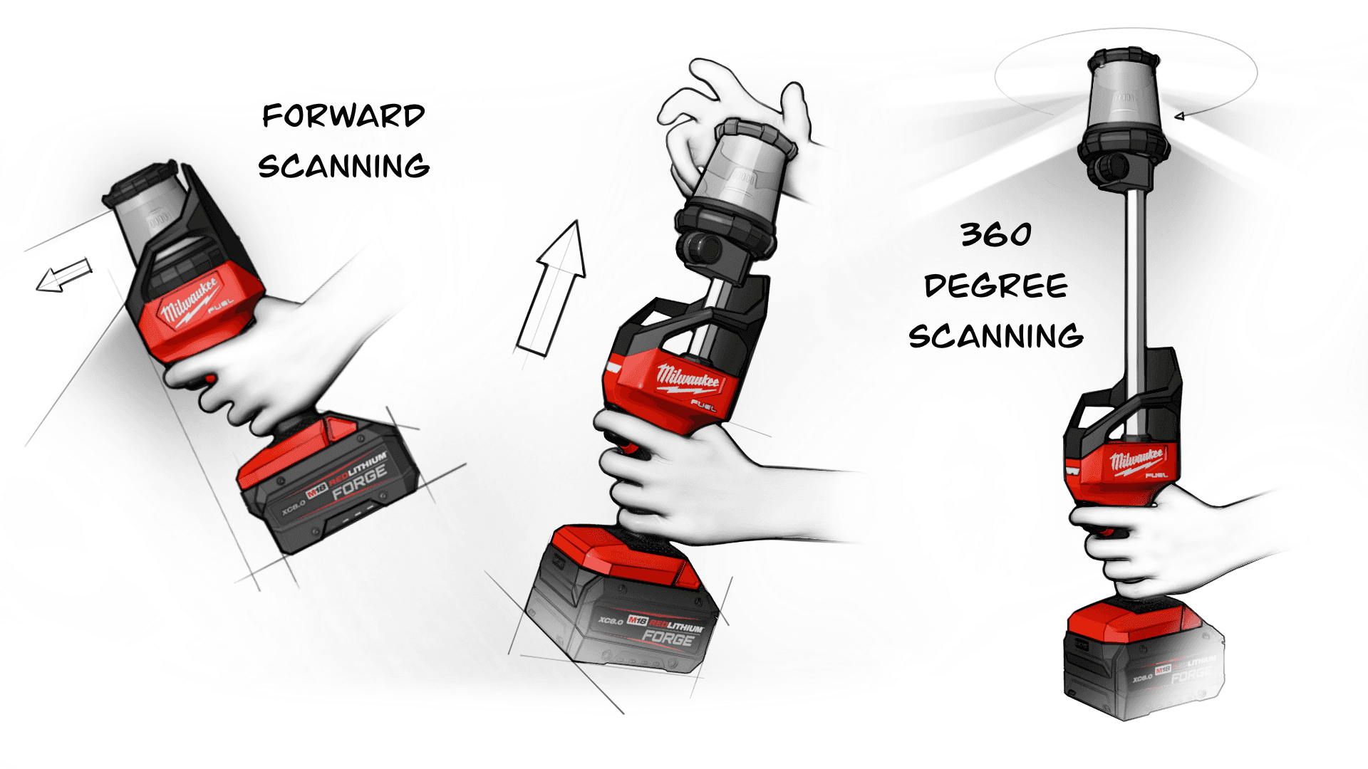 The M18 Scanner can expand to scan 360 degrees above user for full exterior scans, or be used as a point and shoot scanner for scanning individual objects.